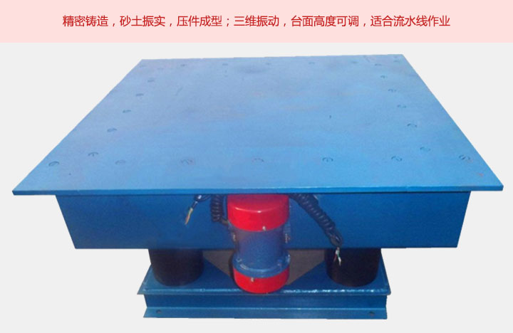 鑄造用振動平臺采用橡膠彈簧和6臺-8臺振動電機組合,具有上下,左右前后的三維振實效果,它具有多結構支撐,結構牢固,密封性好,性能可靠,操作簡單,振動頻率可調(diào)等特點。